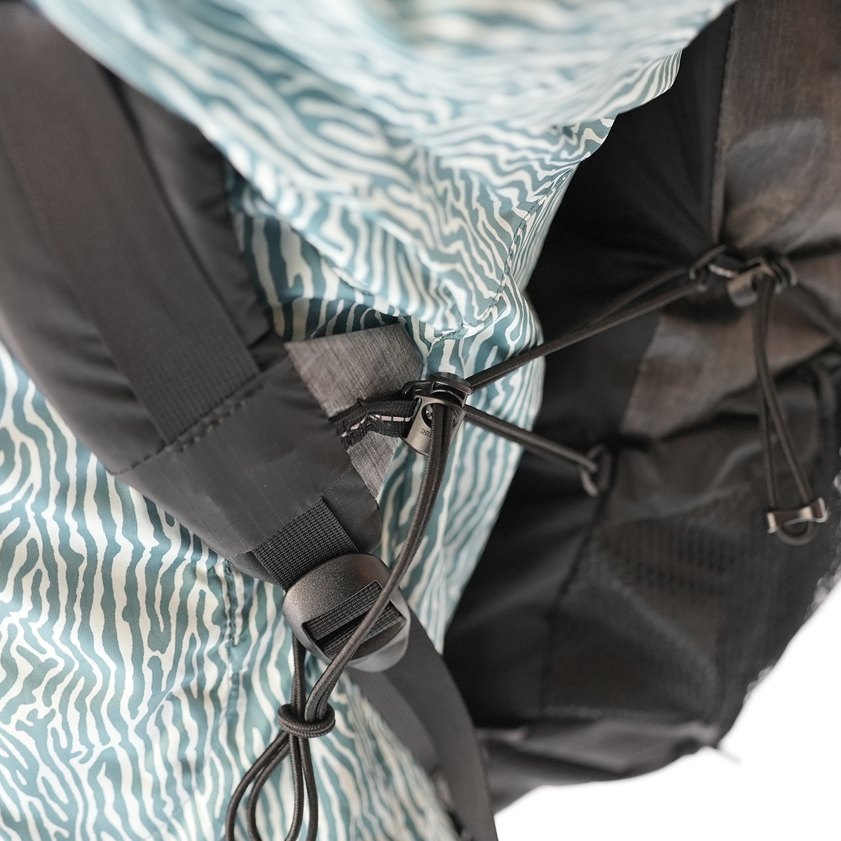 通常は、それぞれ肩に1本ずつ Load Lift Strapで、肩にバックパックを引き寄せますが、バックの側面とネットを吊り上げるコードの延長上、つまり真上の中心ポイントから両肩2本ずつ引き寄せる形式をとりました。