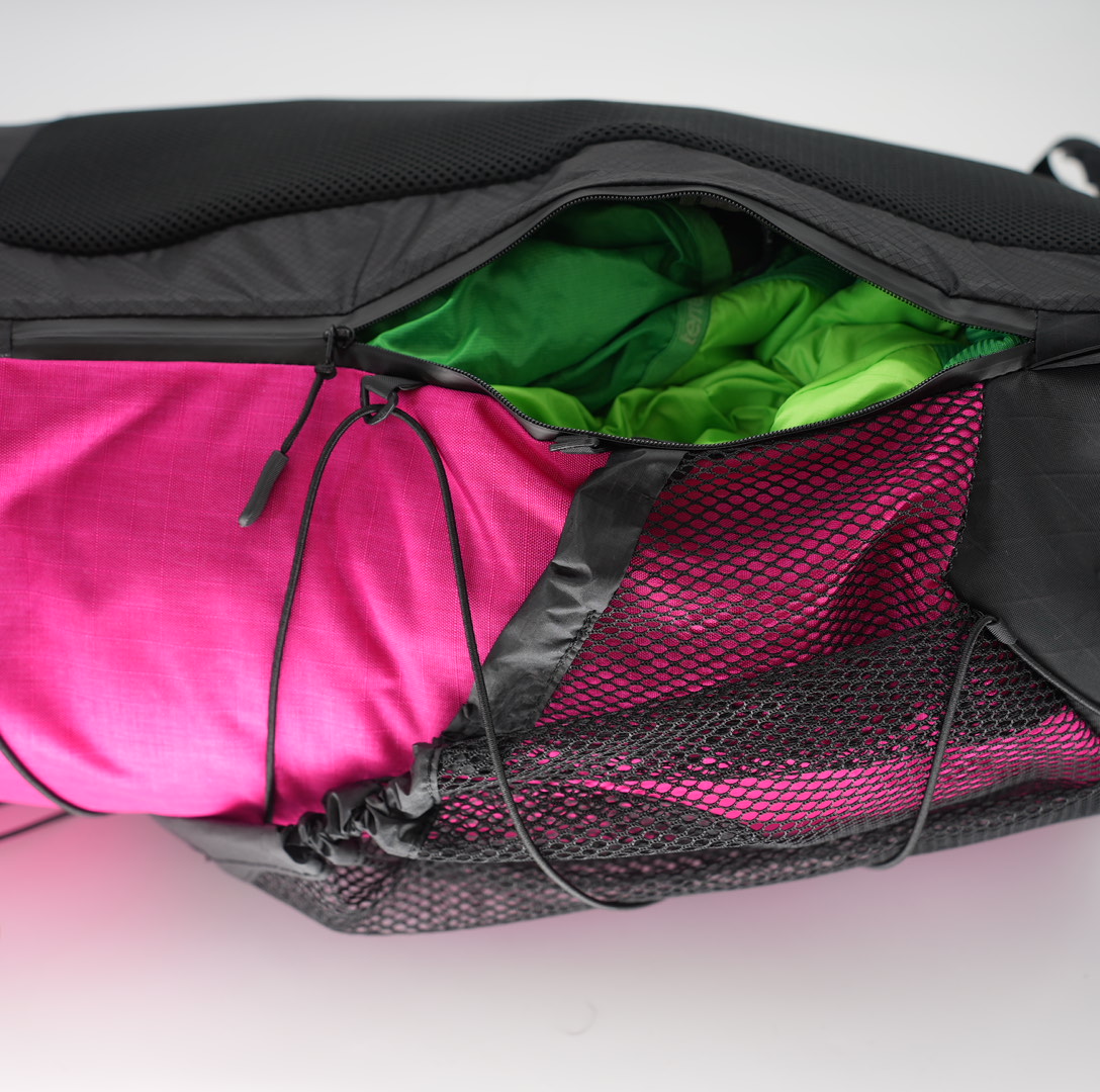 ザック本体はシンプルなレイアウトになっていますが、ネット部分を丸く容量を稼ぐデザインにしました。